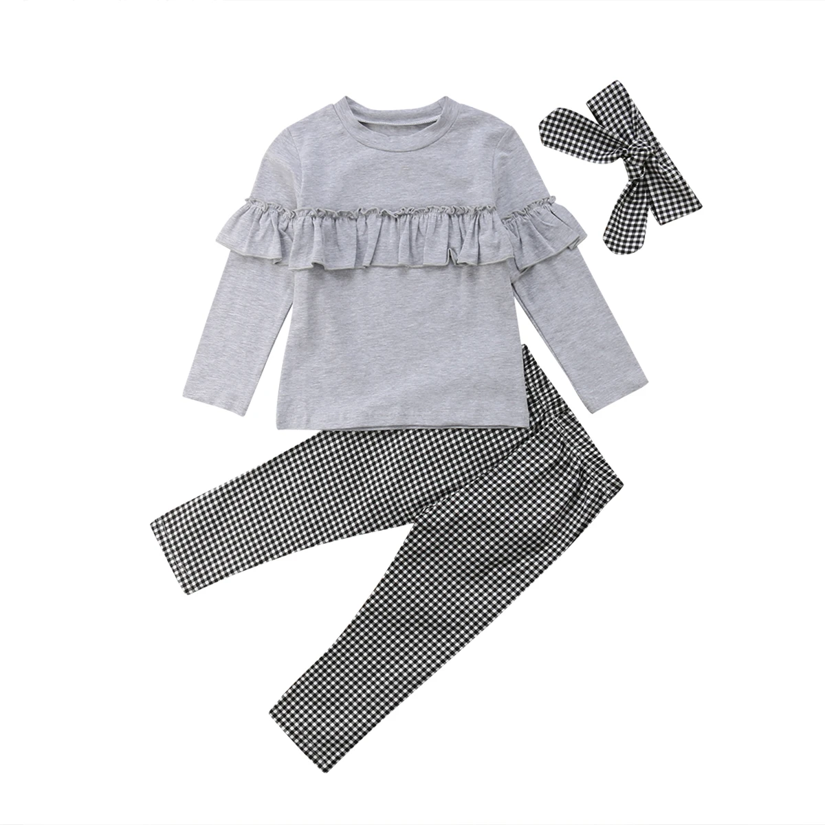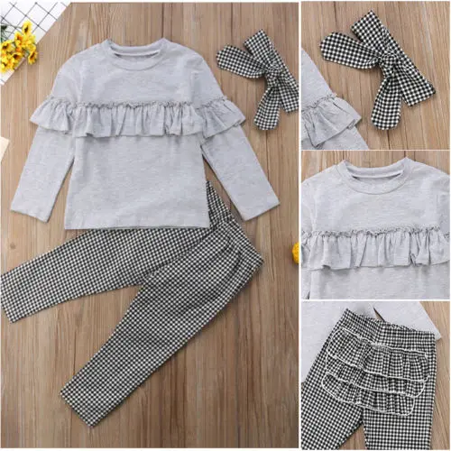 Offer New 2 Piece Set Toddler Kids Baby Girl Clothes Ruffle Long Sleeve Tops + Plaid Pants Leggings +head